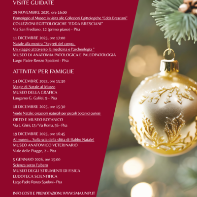 Leggi tutto >Nei suoi quasi settecento anni di vita l’Università di Pisa ha via via raccolto, a scopo didattico o di studio, un vasto e variegato patrimonio storico, scientifico e artistico. Il Sistema Museale di Ateneo (SMA) con i suoi nove musei cittadini e il Museo di Storia Naturale di Calci, centro autonomo di Ateneo che si trova nella Certosa di Calci, hanno il compito di valorizzare, conservare e incrementare tale patrimonio, curandone gli allestimenti e diffondendone sempre più la conoscenza.