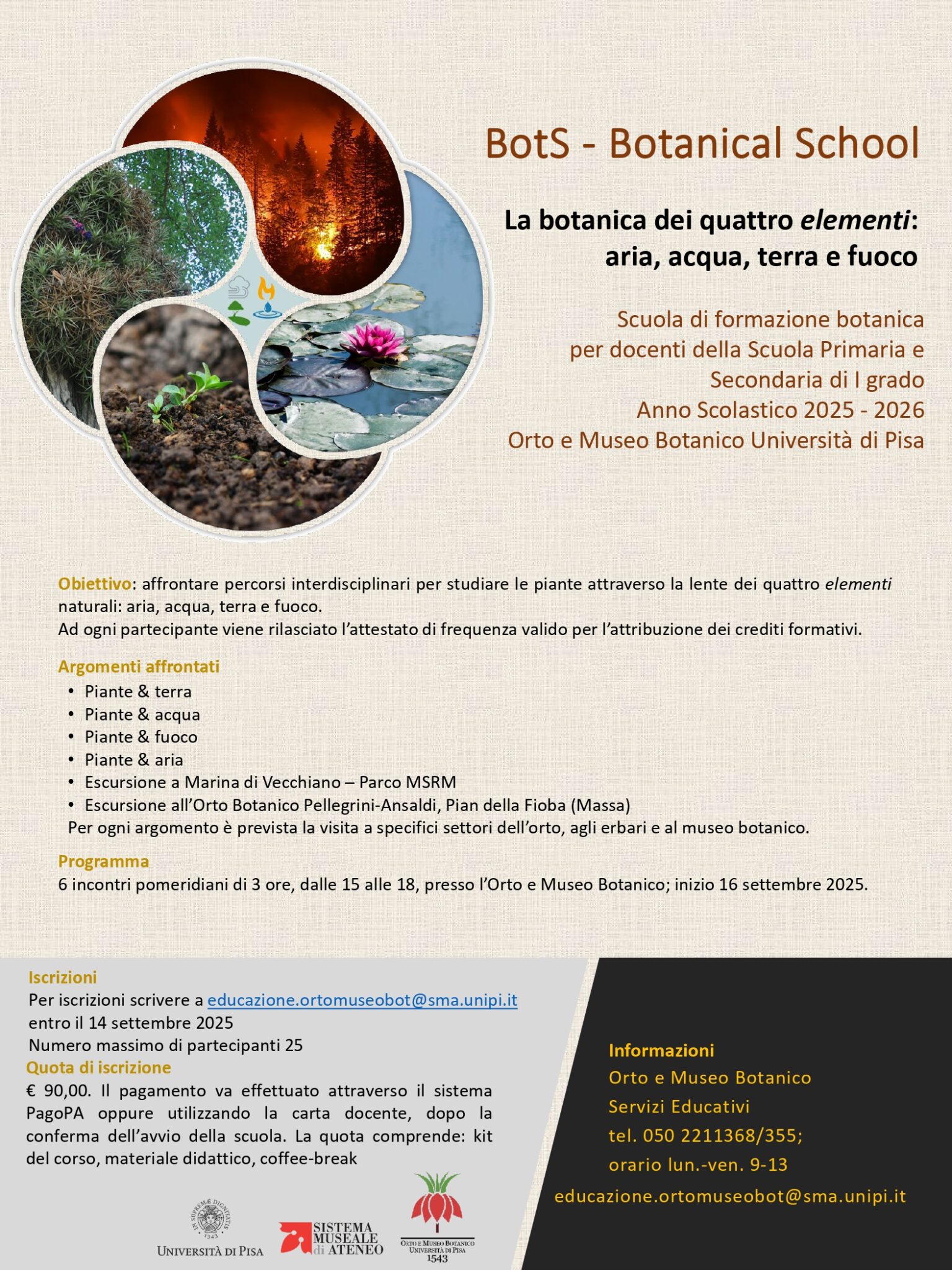 Parte a settembre “La botanica dei quattro elementi: aria, acqua, terra e fuoco”, sesta edizione di BotS – Botanical School, il percorso di formazione e aggiornamento organizzato all’Orto e Museo Botanico dell’Università di Pisa, rivolto ai docenti della scuola primaria e secondaria di primo grado.