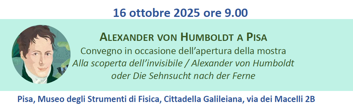 In occasione dell’apertura della mostra Alla scoperta dell’invisibile / Alexander von Humboldt oder Die Sehnsucht nach der Ferne, con il contributo di Goethe-Institut Italia, l’Associazione Culturale Italo-Tedesca Pisa – ACIT, del Dipartimento di Filologia, Letteratura e Linguistica e del Dipartimento di Medicina Clinica e Sperimentale il Museo degli Strumenti di Fisica-Ludoteca Scientifica in collaborazione con l’Associazione Italiana Alexander von Humboldt, il DAAD – Centro tedesco per lo scambio accademico e il Sistema Bibliotecario di Ateneo organizza: