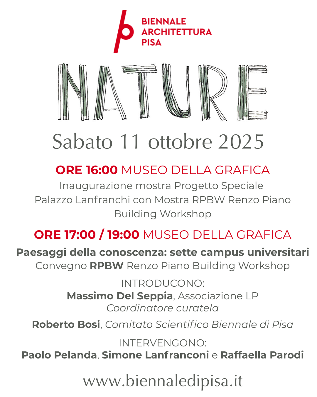 La Biennale, nata nel 2015, è un festival diffuso, gratuito e aperto a tutti, dove architettura, innovazione e sostenibilità si incontrano per ispirare nuove visioni del vivere contemporaneo. Curata dall’Associazione LP con il sostegno del Comune di Pisa, ogni due anni trasforma la città in uno spazio di ricerca, confronto e ispirazione, aperto ad architetti, studiosi, studenti, istituzioni e cittadini.